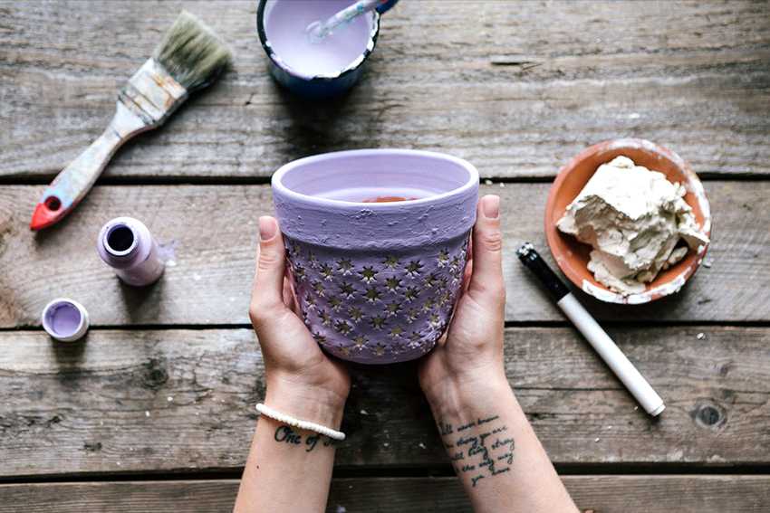 Самым популярным материалом для изготовления цветочного горшка является глина, из которой можно выполнить изделия разного размера и формы. Для этого понадобятся самозатвердевающий материал, пластиковый контейнер, акриловая краска и лак влагозащитный.
