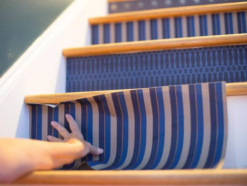 Фантазия не должна ограничиваться рамками стен и потолка. При желании обойными обрезками можно декорировать любые поверхности, в том числе и подступенки лестницы. Идея полезна для владельцев двухэтажных загородных домов – она поможет утилизировать неформатные обрезки, которые невозможно использовать другим способом. Чтобы декор не износился слишком быстро, предпочтение отдают самым толстым и прочным шпалерам: флизелиновым или виниловым.