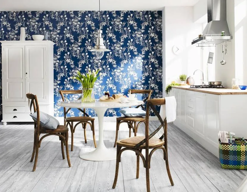 Производители выпускают коллекции обоев с изображением плитки. Это может быть рисунок в скандинавском, восточном или старинном немецком стиле. Если у вас осталось немного обоев, имитирующих плитку, они помогут оформить кухонный фартук. Эффектные обои, защищенные закаленным стеклом – необычная альтернатива классической кафельной плитке.