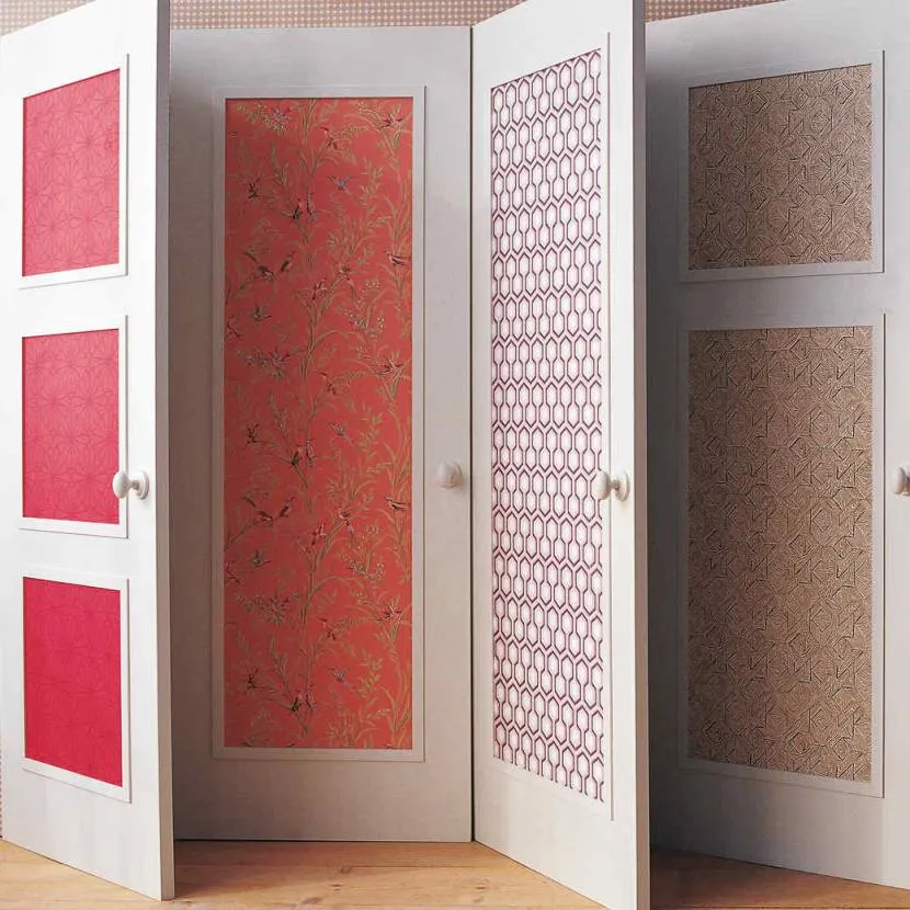 Обрезками шпалер украшают межкомнатные двери; такой декор не только оживит обстановку, но и скроет дефекты или неровности. Дверь станет акцентом и, возможно, добавит в дизайн помещения свежую нотку эклектики. Если для вас важна маскирующая роль, выбирайте флизелиновые или текстильные обои.