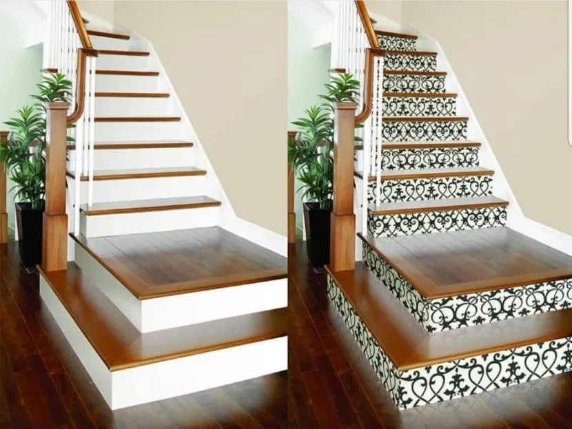 Стильно смотрится внутренняя лестница с обклеенными остатками обоев подступенниками. Сюда идеально подойдут остатки влагостойких обоев, гармонирующие по цвету с окружающим интерьером. Прекрасно будет смотреться контрастный геометрический рисунок или традиционный орнамент.