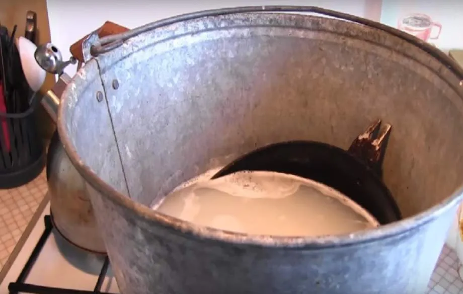 Залейте в большую железную емкость десять литров воды, добавьте туда перечисленные «ингредиенты» и, собственно, сковороду – она должна быть полностью скрыта в воде. Поставьте чан на огонь и кипятите не менее 2 часов. |