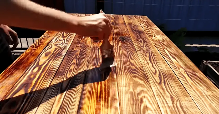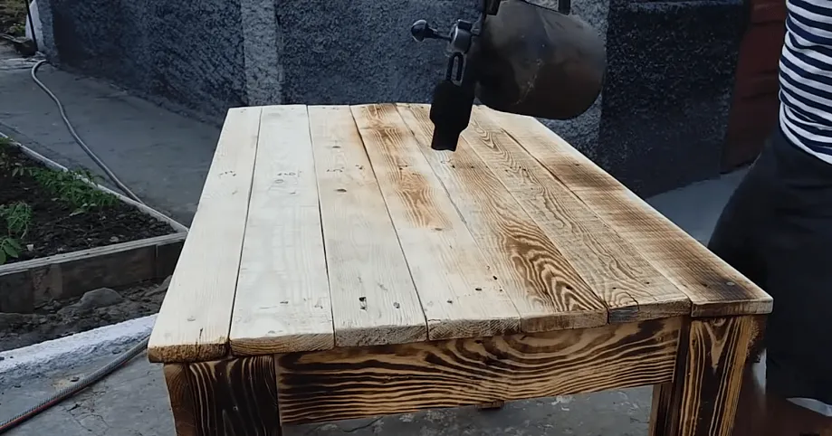 После сборки стола проверьте все углы на наличие заусенцев, тщательно отшлифуйте срезы. Разожгите паяльную лампу и обработайте поверхность древесины, как это показано на фотографии выше. Степень обжига в данном случае зависит от вашего желания: если хотите сделать стол более тёмным – задерживайте факел горелки чуть дольше на одном месте, если светлее – проходите быстрее. Впрочем, вы можете сделать тестовый обжиг обрезков, которые у вас обязательно останутся.
