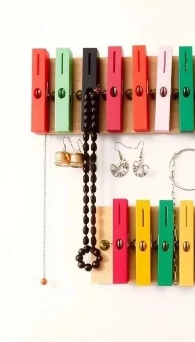 Инструкция: Приклейте прищепки к картонной основе, располагая их в ряд. Покрасьте прищепки в яркие цвета. Подставка готова! На прищепки можно вешать серьги, браслеты и другие украшения.