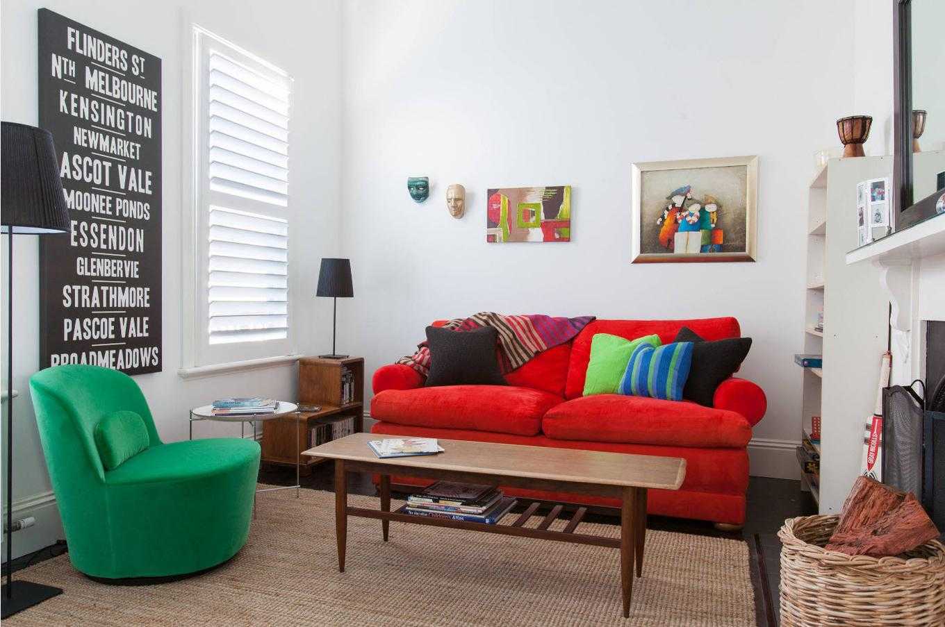 Мебель и обивку для дивана и кресел в данном случае лучше выбирать в самых ярких тонах. Для того чтобы такой дизайн смотрелся гармонично и стильно, цвет стен, пола и потолка должен быть нейтральным. Они служат лишь скромным фоном для предметов интерьера. Лучше вообще отдать предпочтение белому цвету.
