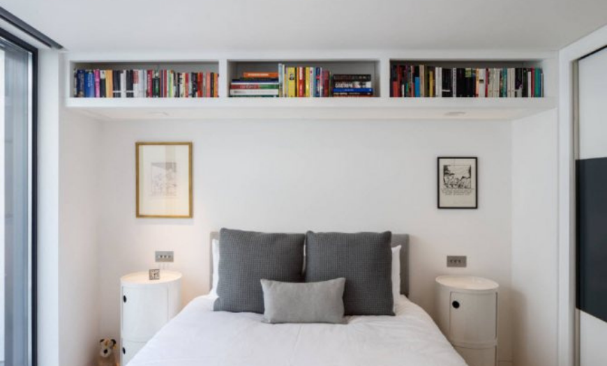 Вместо обычной прикроватной тумбочки здесь стоят стеллажи, использующие место и по вертикали.