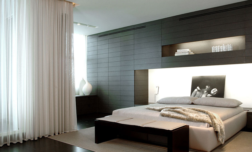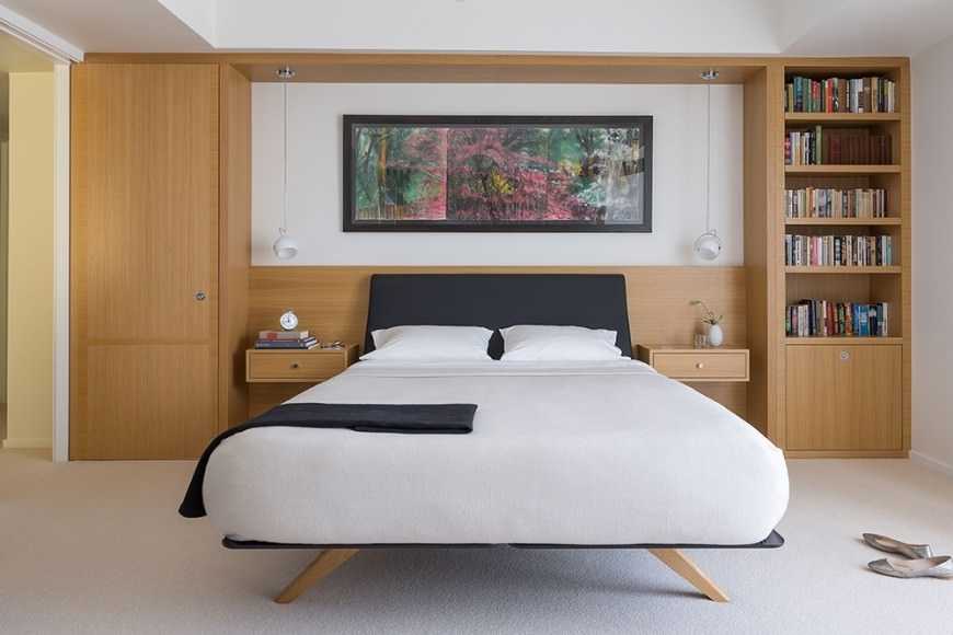 Ещё одной идеей экономии места для хранения являются стены с утопленными полками или нишами. Это вариант для тех, кто все ещё планирует, как должна выглядеть их будущая спальня, и любит креативные идеи дизайна интерьера.
