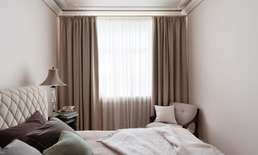 Интерьер маленькой узкой спальни в классическом стиле. Одна из стен за изголовьем кровати оклеена обоями в тон основного цвета комнаты.