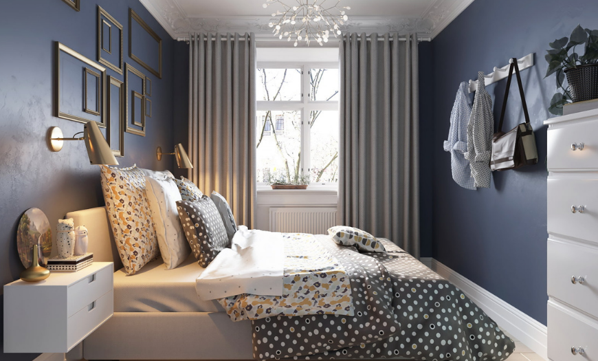 Когда речь заходит о маленькой спальне, вопрос выбора цвета для стен становится крайне актуальным. Так уж сложилось, что небольшие помещения выглядят объемнее и просторнее, если стены имеют светлые оттенки: белый, бежевый, светло-серый и т.п. Любителям скандинавского стиля или минимализма такой вариант точно придется по вкусу.