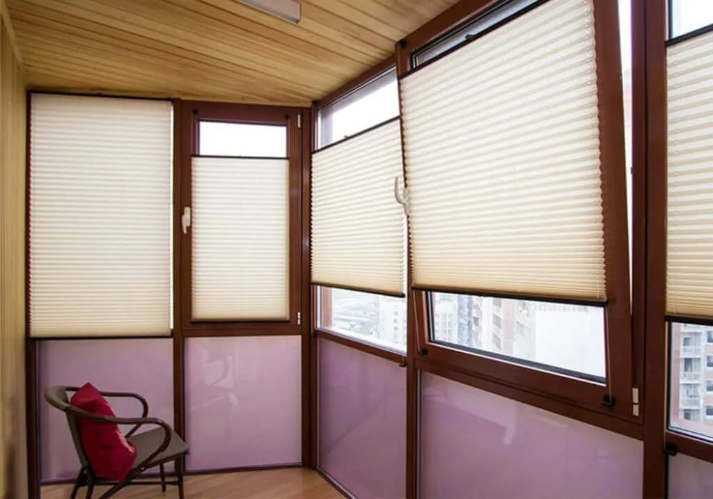Ещё один возможный вариант – шторы-плиссе, разновидность жалюзи. Они изготовлены из плотного текстиля, поэтому смотрятся более «домашними». Конструкции устанавливаются в створку и могут открываться вместе с окном или фрагментарно (снизу или сверху).