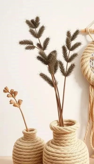 Техника: Обмотка стеклянной или пластиковой основы. Материалы: Джут, клей ПВА, ножницы. Сложность: Легко. Создайте уникальную вазу, обмотав обычную стеклянную вазу джутом. Добавьте декоративные элементы – ракушки, бусины.