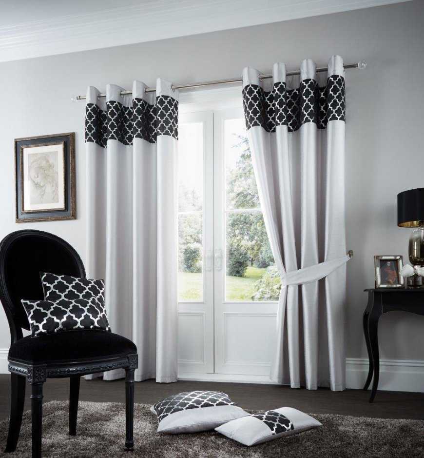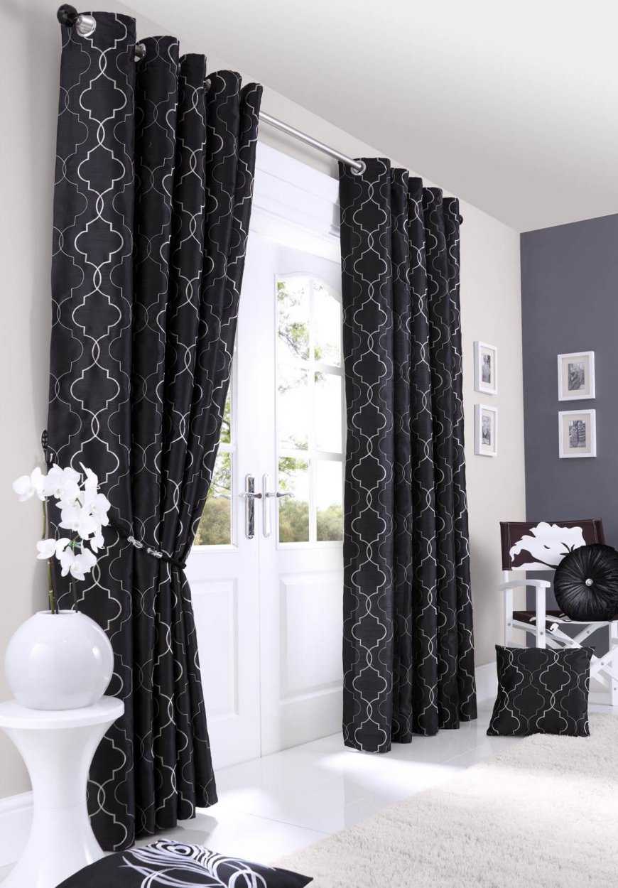 Ваши шторы не обязательно должны быть однотонными. Черный узор будет богато смотреться, если выдержать общий стиль комнаты.