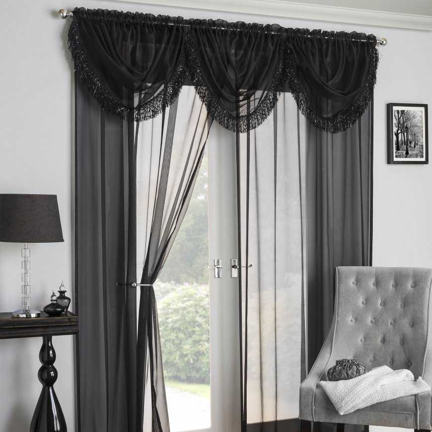 Просто повесить черные шторы было бы неразумно, так как они выглядят слишком скучно, независимо от того, как вы их задрапируете. А вот добавление серо-черных или серебристых тюлевых штор не помешает, а даже улучшит ситуацию. Композиция в этом случае будет выглядеть по-деловому элегантно.