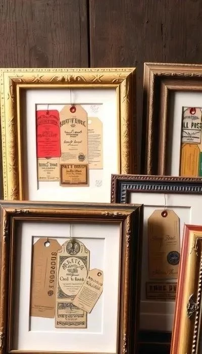 Материалы: Рамка, бирки, клей, фотографии. Инструкция: Приклейте бирки к рамке, создавая интересный узор или коллаж. Вставьте фотографию. Фото: (Представьте здесь фото рамки, украшенной бирками)