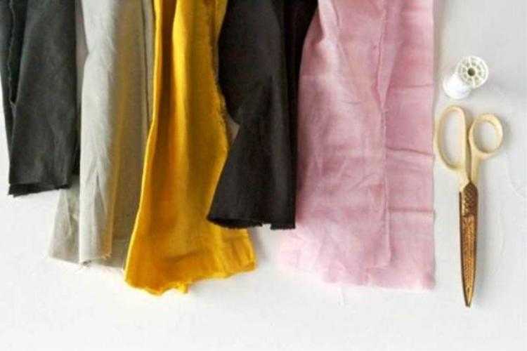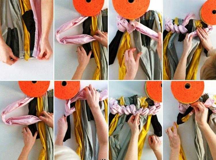 Возьми ненужные футболки и любые другие лоскуты ткани, ножницы, нитку с иглой и клейкую ленту. Нарежь полосы примерно одной ширины и толщины и выложи их вряд на столе, чередуя разные цвета. Закрепи концы скотчем, чтобы во время работы они не ерзали и не соскальзывали.
