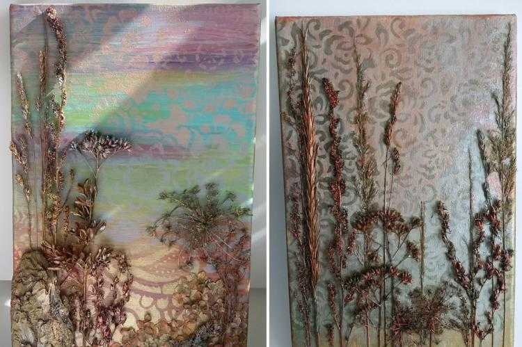 Тебе понадобится холст для работы, краски, трафарет для росписи и любые сухоцветы на твой вкус. Сначала обработай холст на подрамнике разными акриловыми красками. Можешь смешивать матовые с глянцевыми, обычные с перламутровыми – так ты получишь еще и игру фактур.