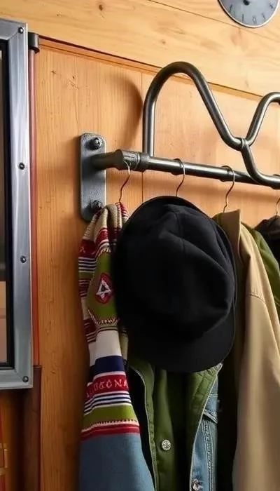 Руль от велосипеда, закрепленный на стене, служит необычной и функциональной вешалкой для одежды.