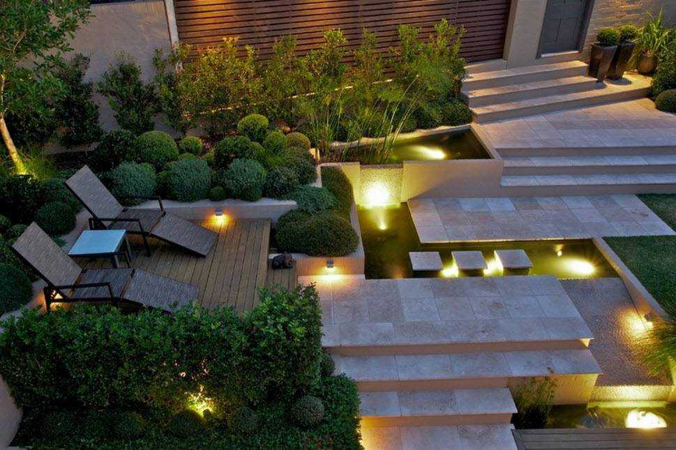 Применение нескольких цветов при освещении деревьев, кустов выводит это приятное занятие на качественно новый уровень. Например, можно воду в искусственном водоёме или бассейне подсветить голубым цветом, а окружающие хвойники и кусты обозначить зелёными или белыми цветовыми пятнами.