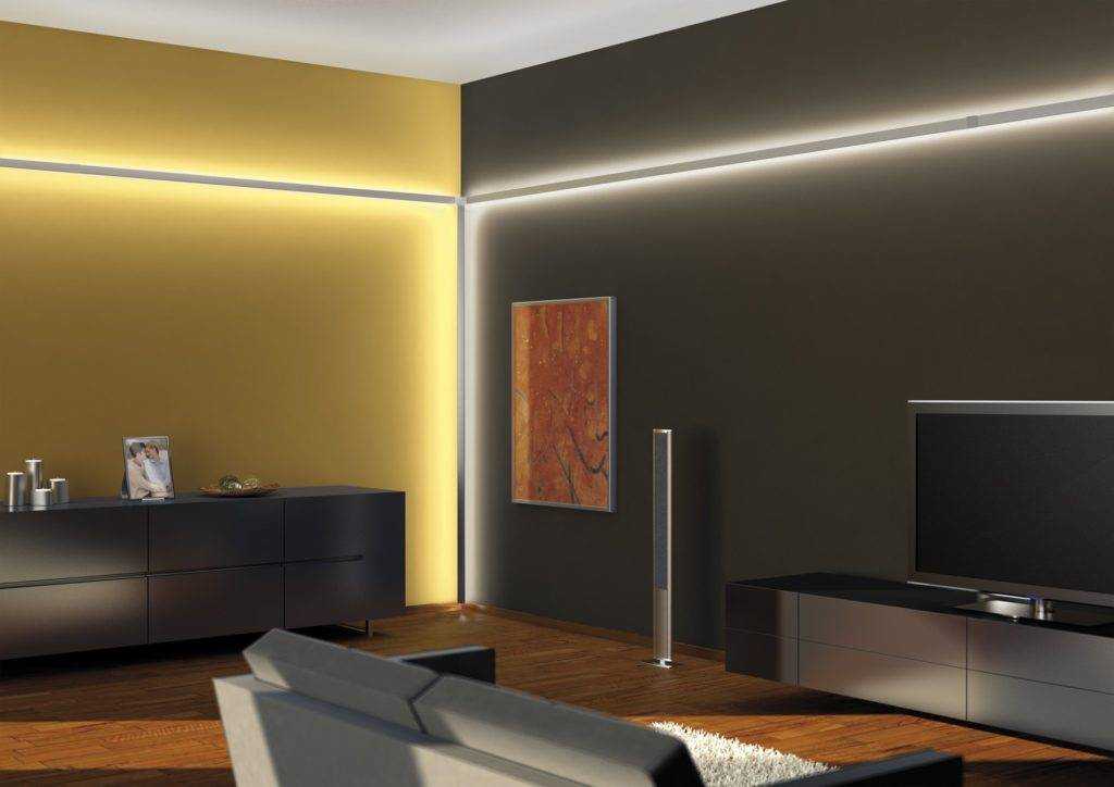 Световое декорирование стены гостиной светодиодными лентами