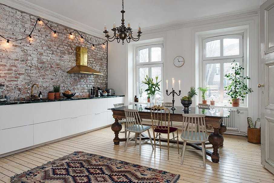 В отличие от лофта, здесь кирпич на кухне выглядит менее грубым, не таким промышленным. С одной стороны – натуральность, с другой – простота и аккуратность. Стена в скандинавском стиле не будет такой акцентирующей и активной.