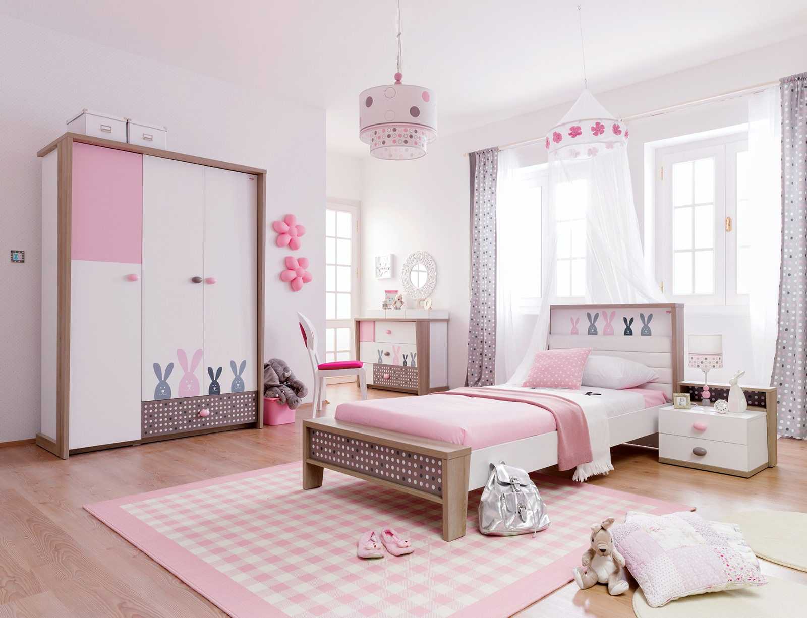 А вот крупные предметы мебели (например, шкаф) лучше сделать в другой цветовой гамме и использовать розовый лишь отделки.