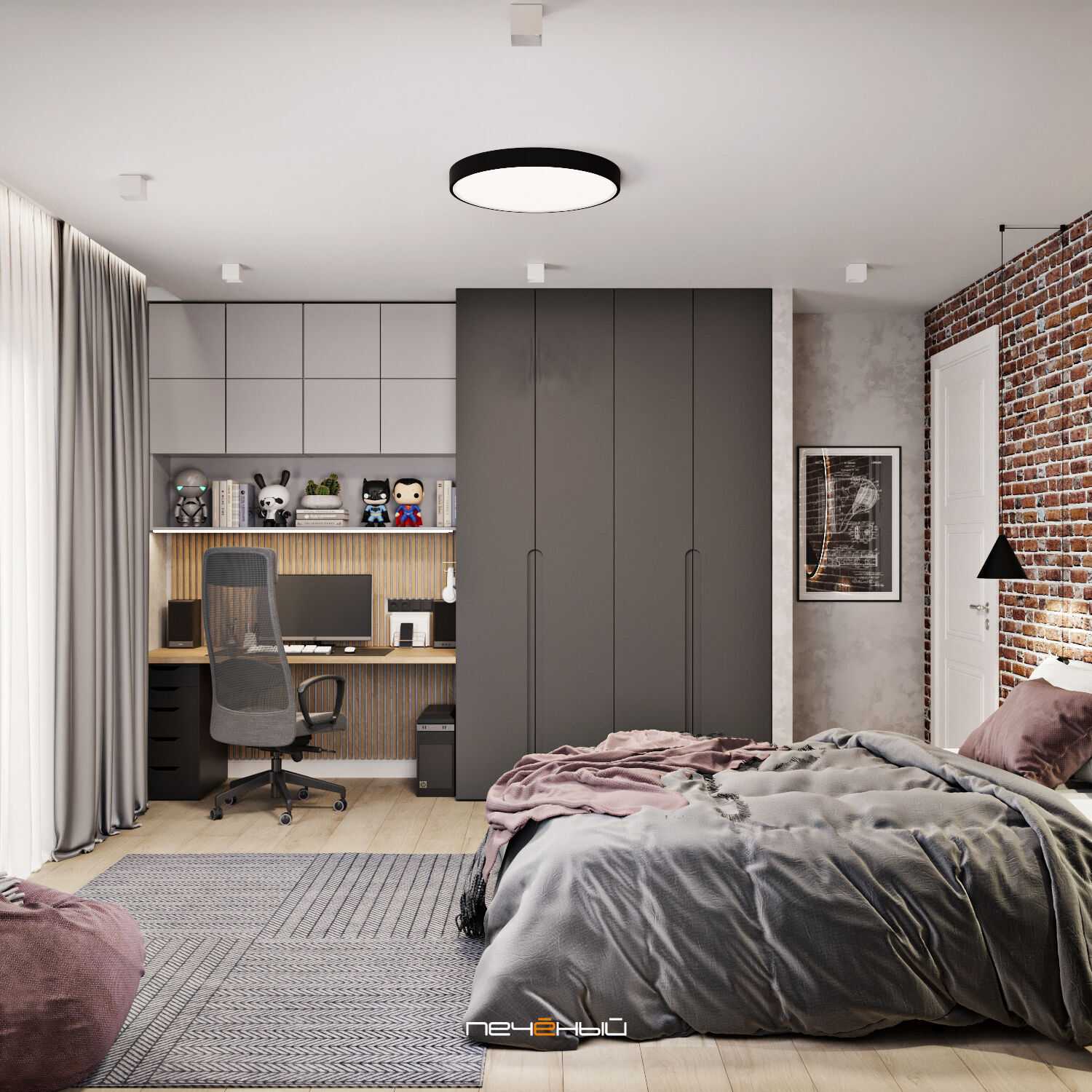 Так, в этом случае, парень сам попросил себе в комнату кирпичную стену, что наша студия дизайна с радостью и воплотила.