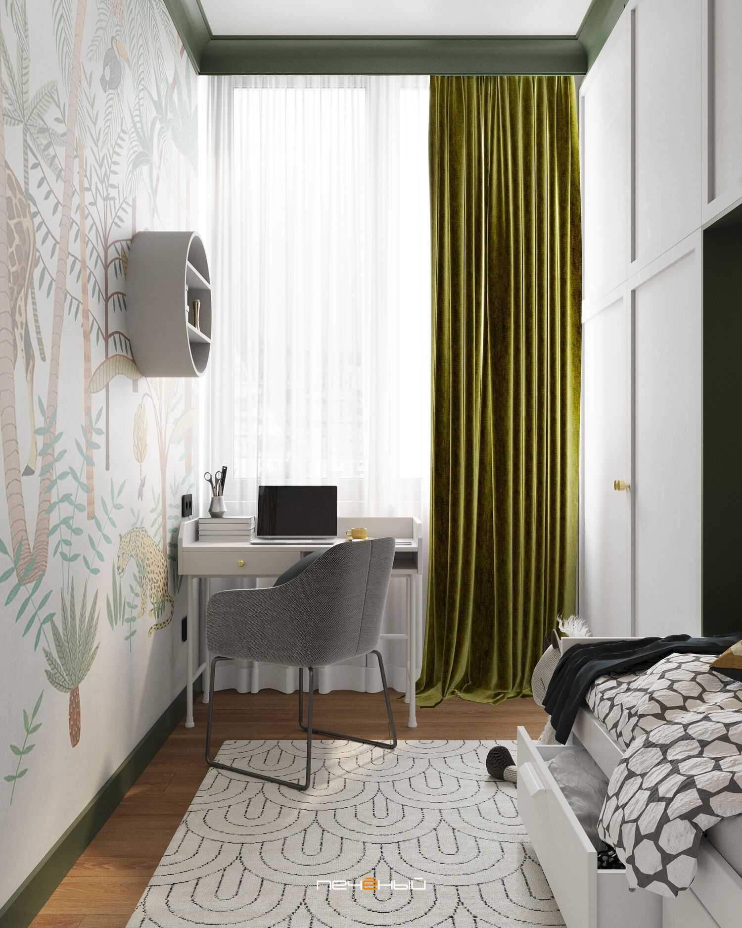Данное помещение, рассчитанное на двух детей требует особенно грамотного зонирования. За счет определенных приемов разграничения пространства, получается добиться максимально эффективного результата.