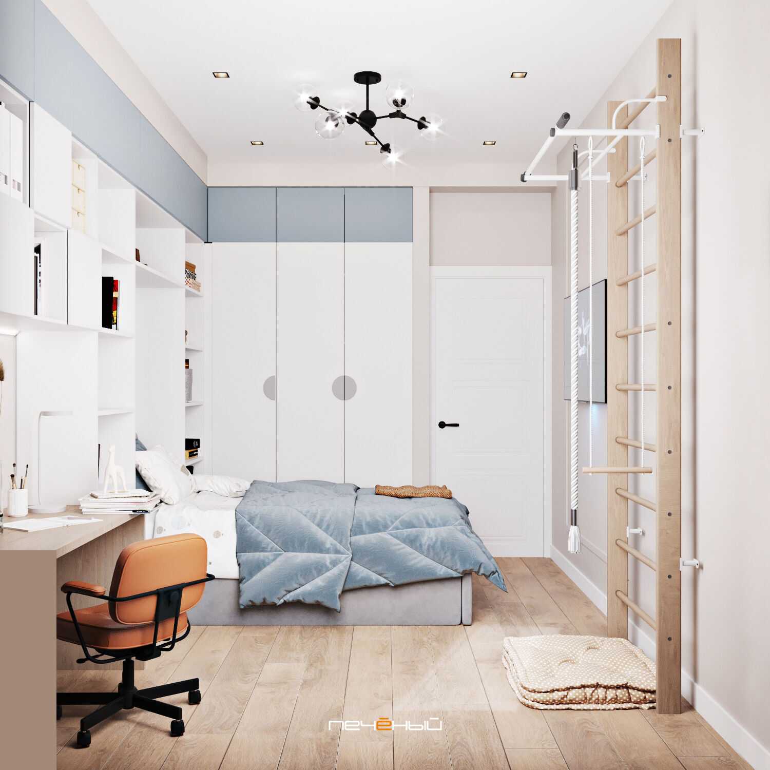 Поскольку школьники и тем более подростки уже достаточно взрослые, можно ставить двухъярусные кровати, не боясь, что дети получат травмы или упадут. Зону для игр уже можно либо сделать меньше, либо убрать вовсе, если братья взрослые. А вот тренажёры для физкультуры полезны в любом возрасте.