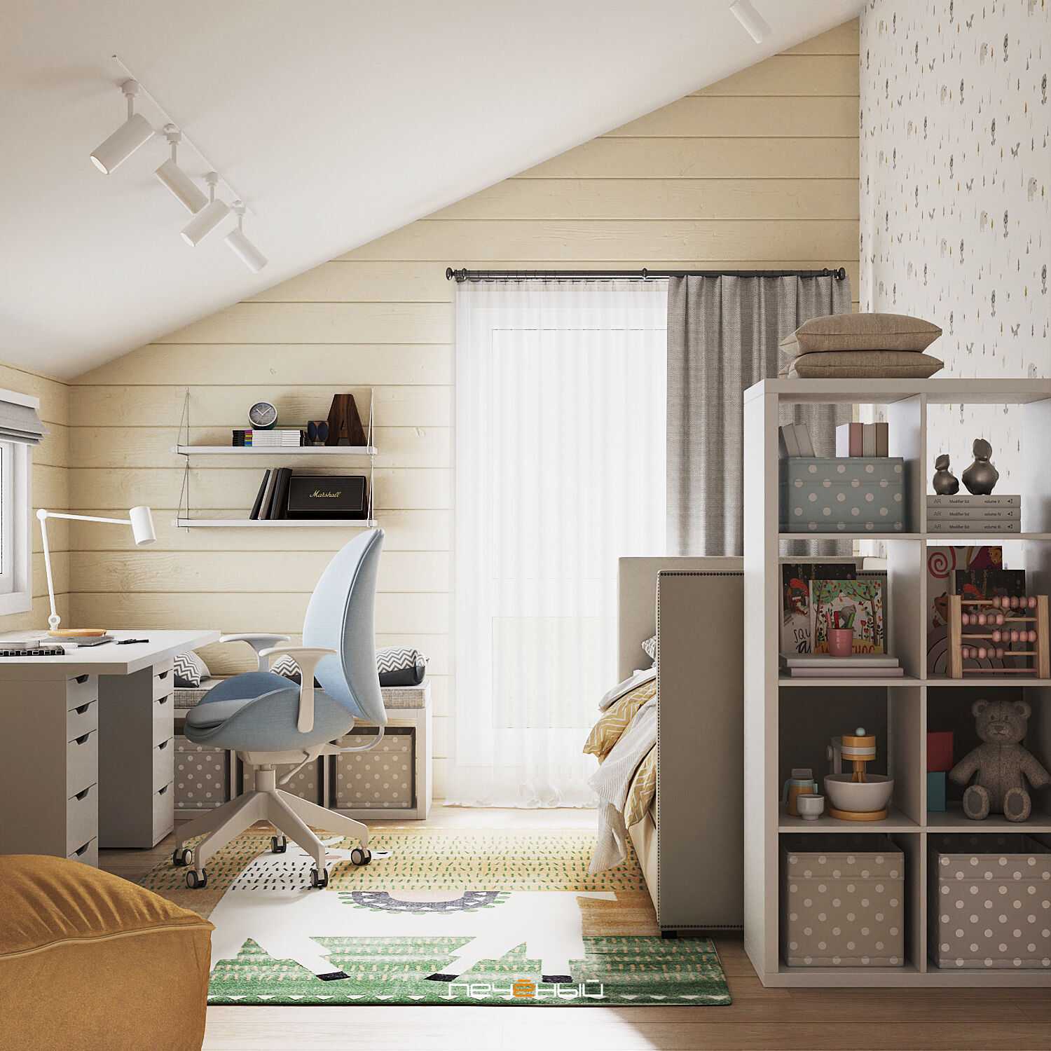 Детская в мансарде. Перед вами дизайн детской комнаты для мальчика. Данная комната расположена в мансардном этаже загородного дома, но такой вариант потолка может встречаться и в хрущёвке с достроенным мансардным этажом.
