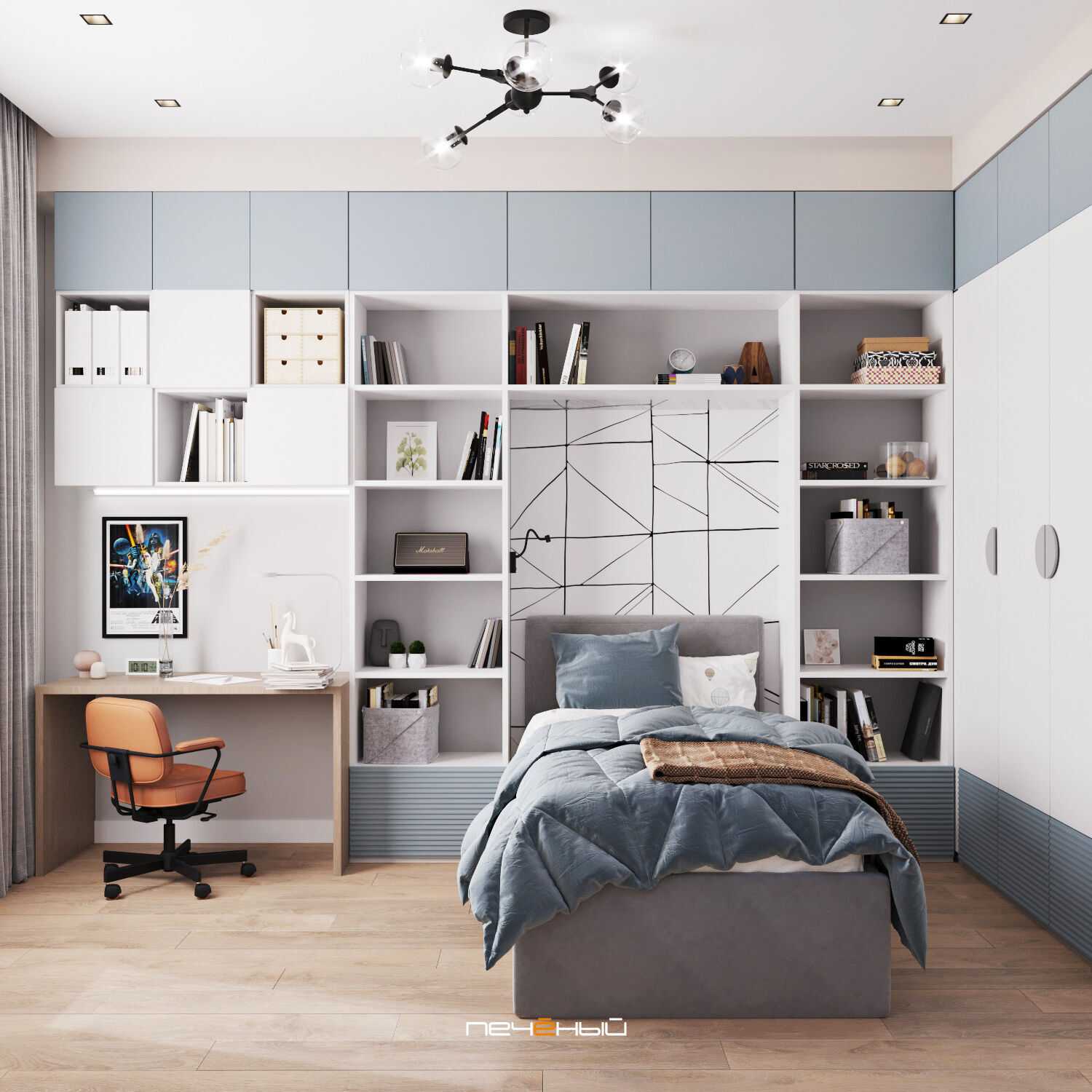 Светлая комната для подростка. Каким должен быть стильный и удобный дизайн детской для подростка, мальчика 12 лет? Может быть, таким, как этот светлый вариант в типовом доме? Удобное рабочее место, много полок, кровать в нише и очень большой шкаф, антресоли которого опоясывают всю комнату.