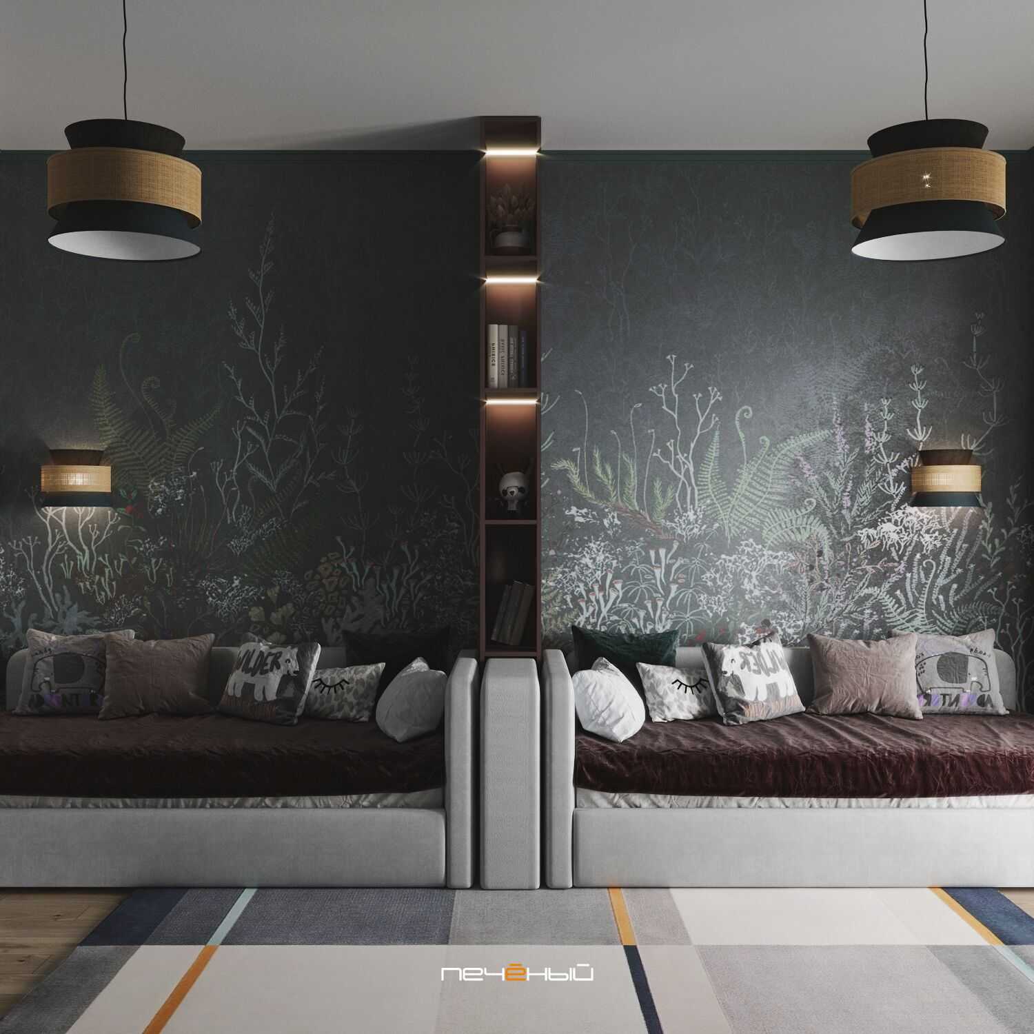 Детская с чёрными обоями. Да, это достаточно смелое решение: поклеить такие тёмные обои в детской комнате. Тем удивительнее, что заказчикам понравилась эта наша идея.