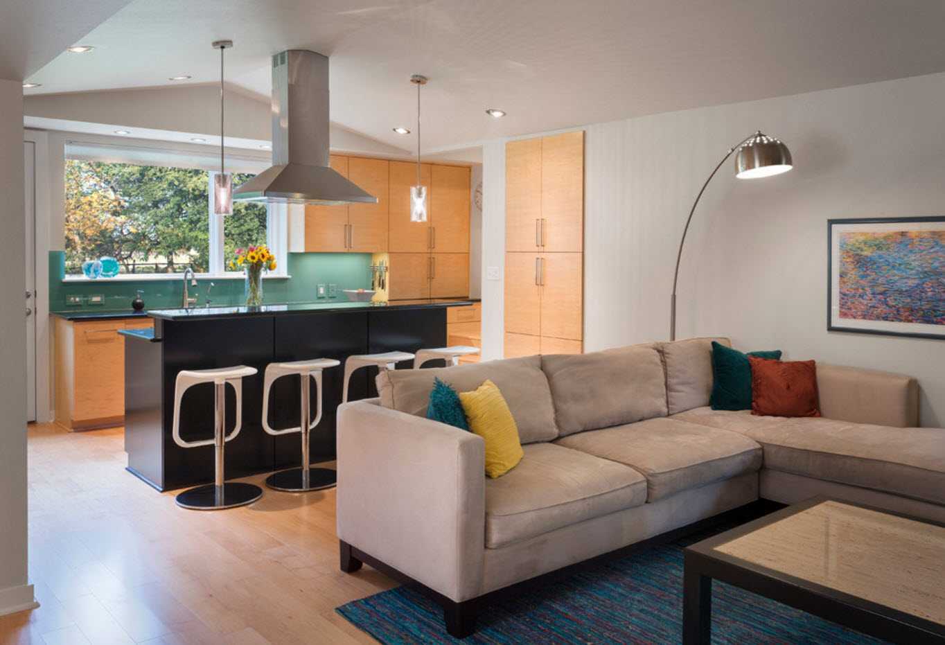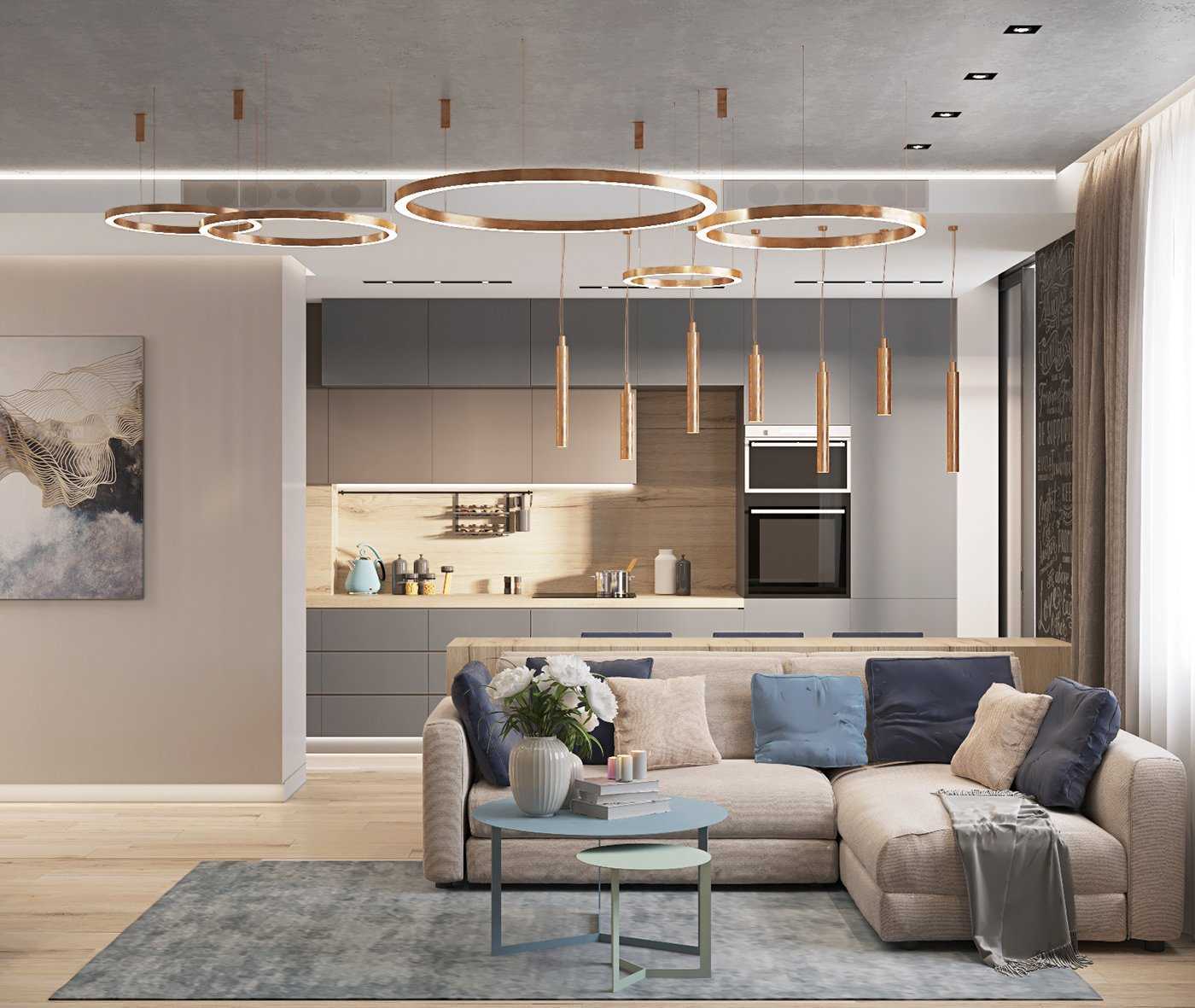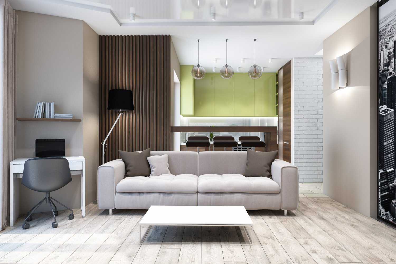- Гостиную совмещают с кухней, рабочим кабинетом или спальней.