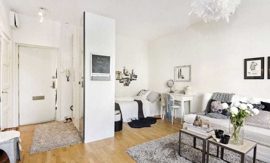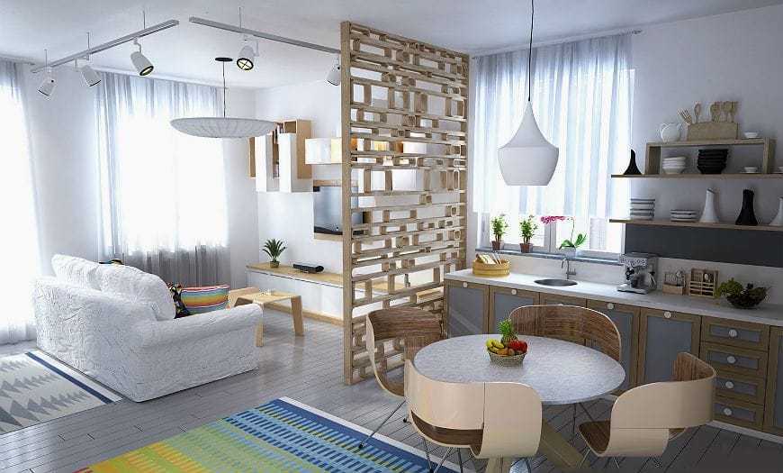 Интересные варианты зонирования несложно организовать, применив передвижные тонкие перегородки на колесиках.