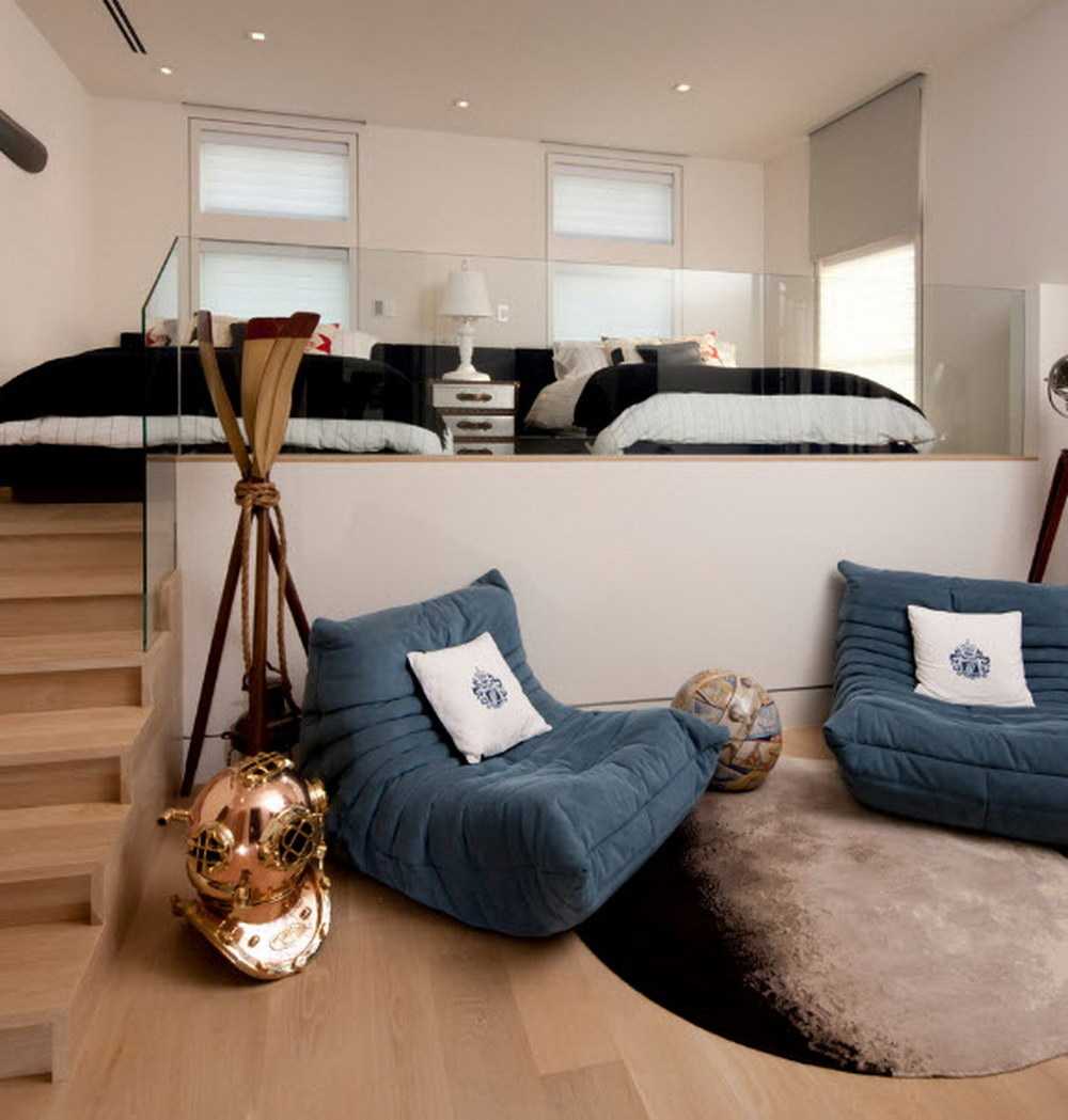 Помимо этого встречаются студии, имеющие потолки высотой от 3,5 м и даже выше. В таких помещениях можно сделать второй ярус, который можно использовать в качестве спальни или домашнего кабинета. Такое решение поможет значительно сэкономить место в нижней части квартиры и при этом с пользой использовать верхнюю часть жилья.