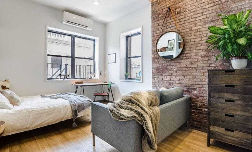 Если квартира расположена в кирпичном доме, можно оставить угол гостиной неоштукатуренным. На фото такой дизайн зала студии выглядит стильно и вызывающе. Его часто можно встретить при создании интерьера в стиле лофт. В процессе отделки стен и потолка используются светлые оттенки. Если объект находится в панельной высотке, то стены можно задекорировать декоративным или натуральным камнем либо создать на поверхности эффект штукатурки со сколами.
