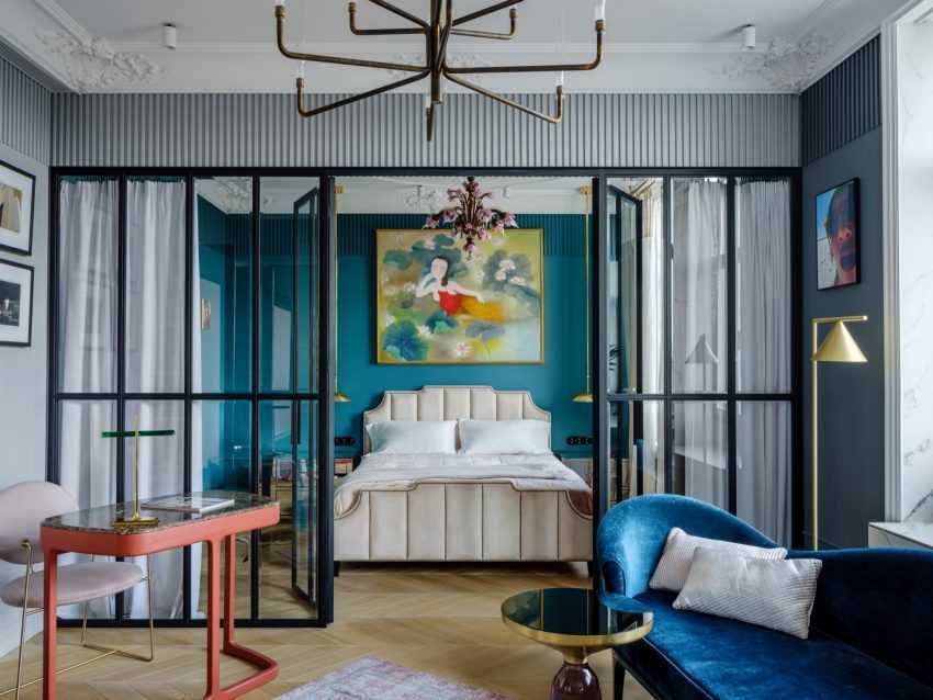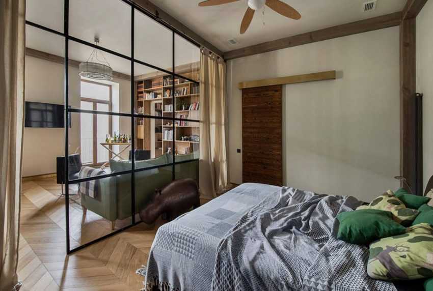 . Отличным вариантом станет установка кровати в отдельно выделенной нише, которую можно отделить, раздвижной перегородкой в виде купейных дверей, легкой или более тяжелой и плотной шторой.