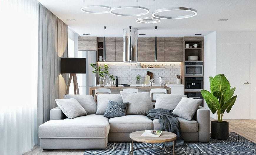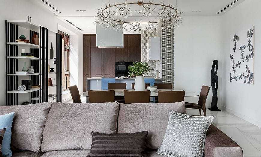 - Невообразимый простор для фантазии. Владелец недвижимости может самостоятельно решить, где расположить рабочую зону кухни, а где оставить уютный и мягкий диван.