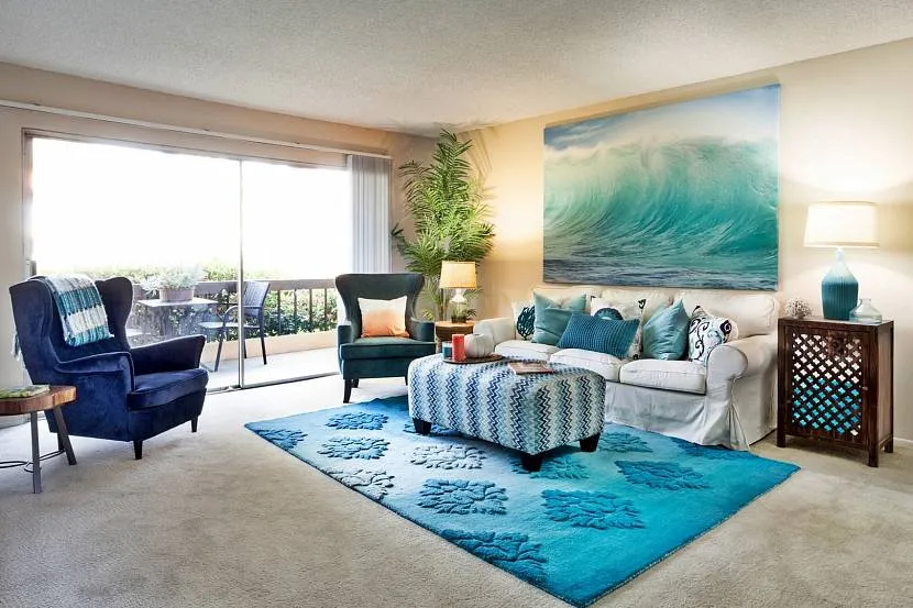 Если вы любитель спокойных цветовых палитр и открытых пространств, придерживайтесь сочетаний лаконичной мебели и насыщенной холодной гаммы оттенков, соответствующих морским мотивам. Смело добавляйте аксессуары в цвете хором и белый метал, такой интерьер будет свежим и чистым, а также он расширит пространство помещения.