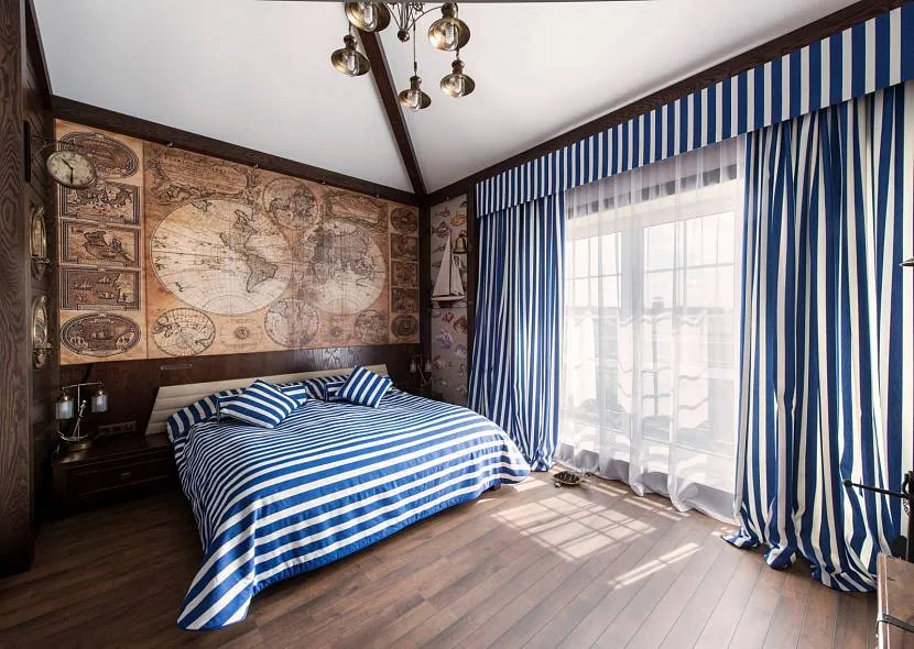 Основная задача — удачно выбрать палитру цвета. На постельных принадлежностях и других вещах непременно должны быть принты на соответствующую тематику. Смело используйте текстиль в полоску – для комплектов белья, декоративных наволочек на подушки, занавесок и покрывала.
