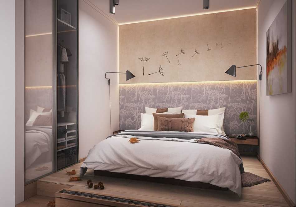 Для спальни нужно предусмотреть систему шкафчиков и полок, которые не должны мешаться под ногами. Их размещают на стене.
