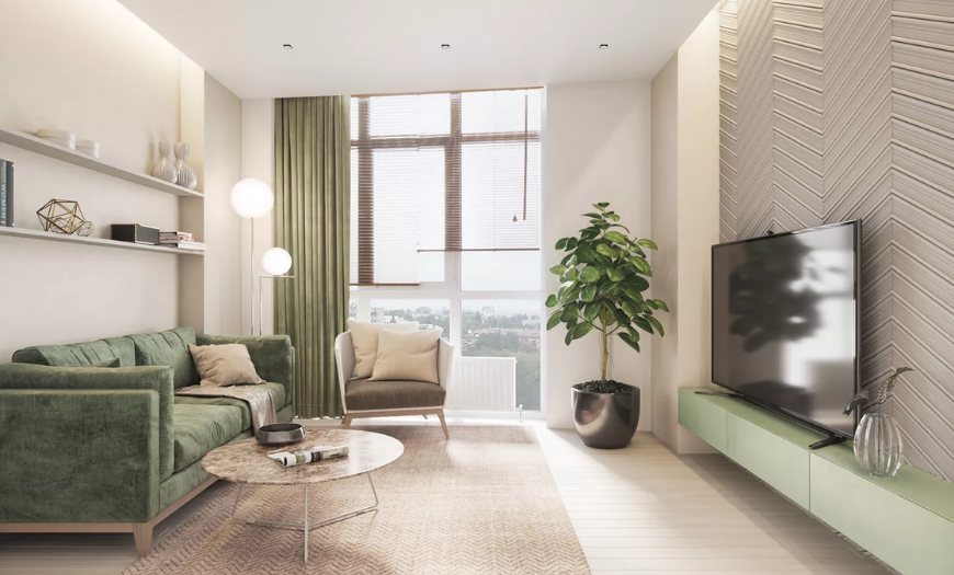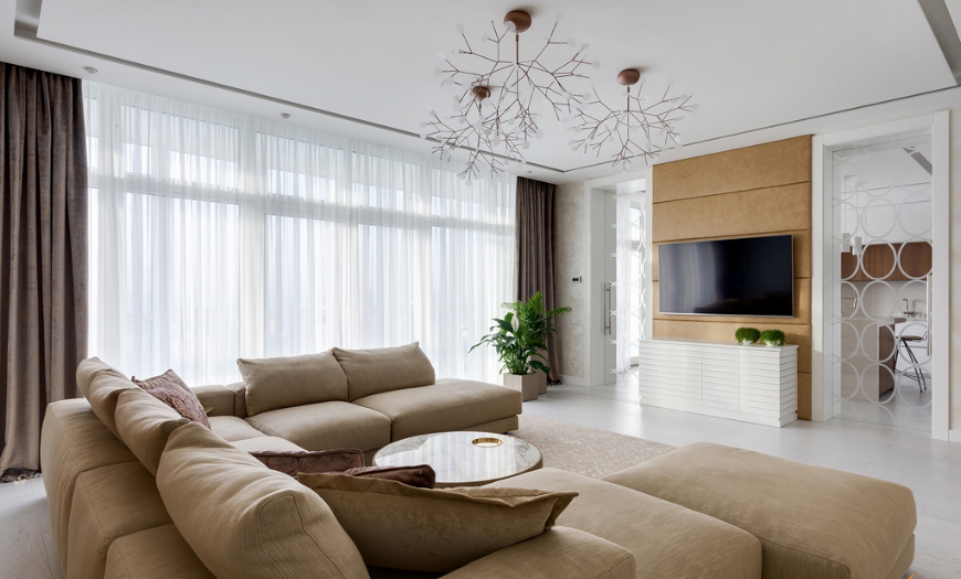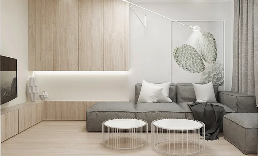 Нейтральная цветовая гамма подходит для гостиных в скандинавском или минималистском стиле. К тому же такая палитра допускает разводки как теплых, так и холодных оттенков.