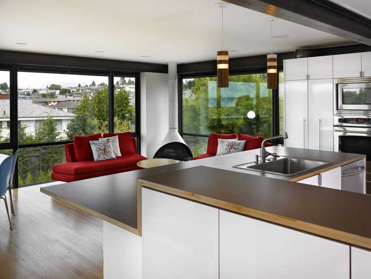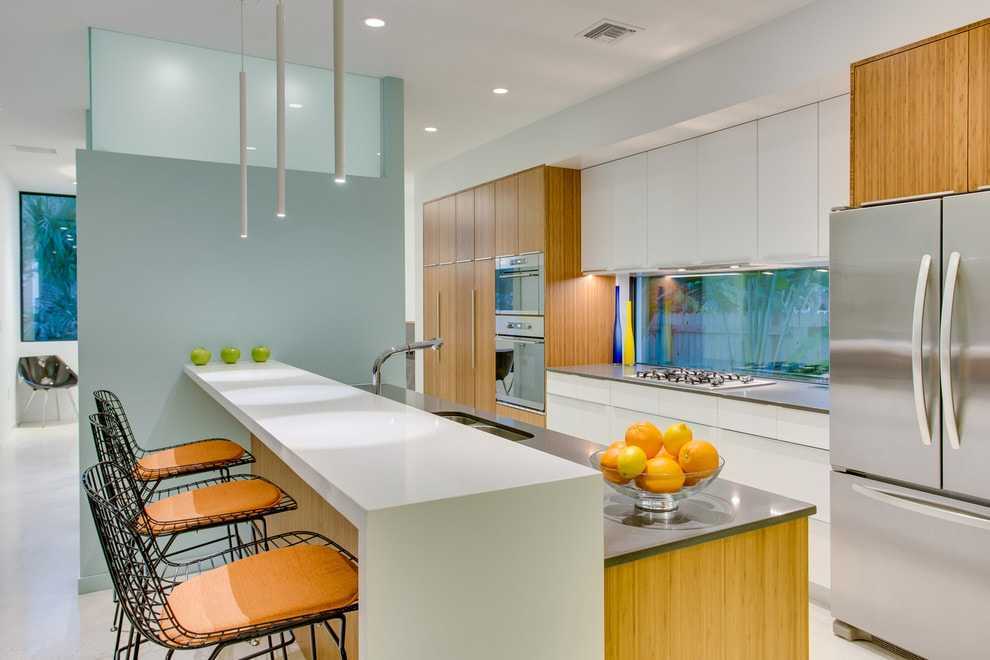 - Открывает обзор гостиной. Высокая барная стойка позволяет, принимая пищу, смотреть телевизор или общаться с гостями, которые находятся в гостиной в другом конце комнаты.