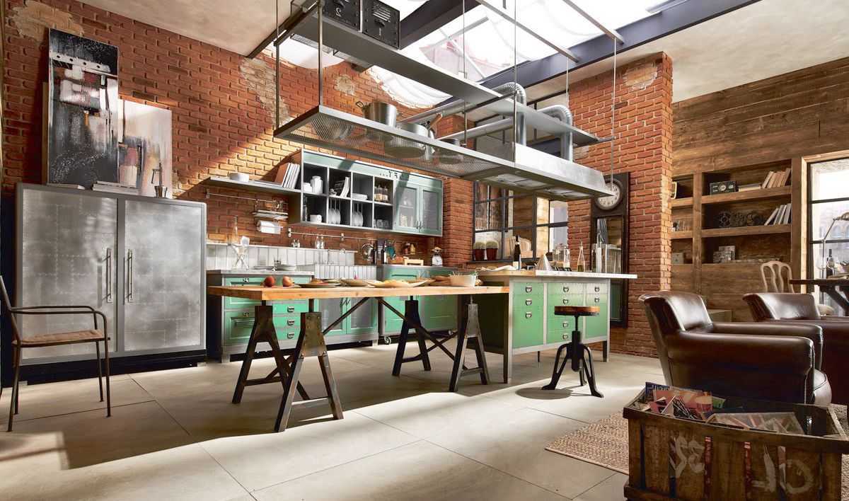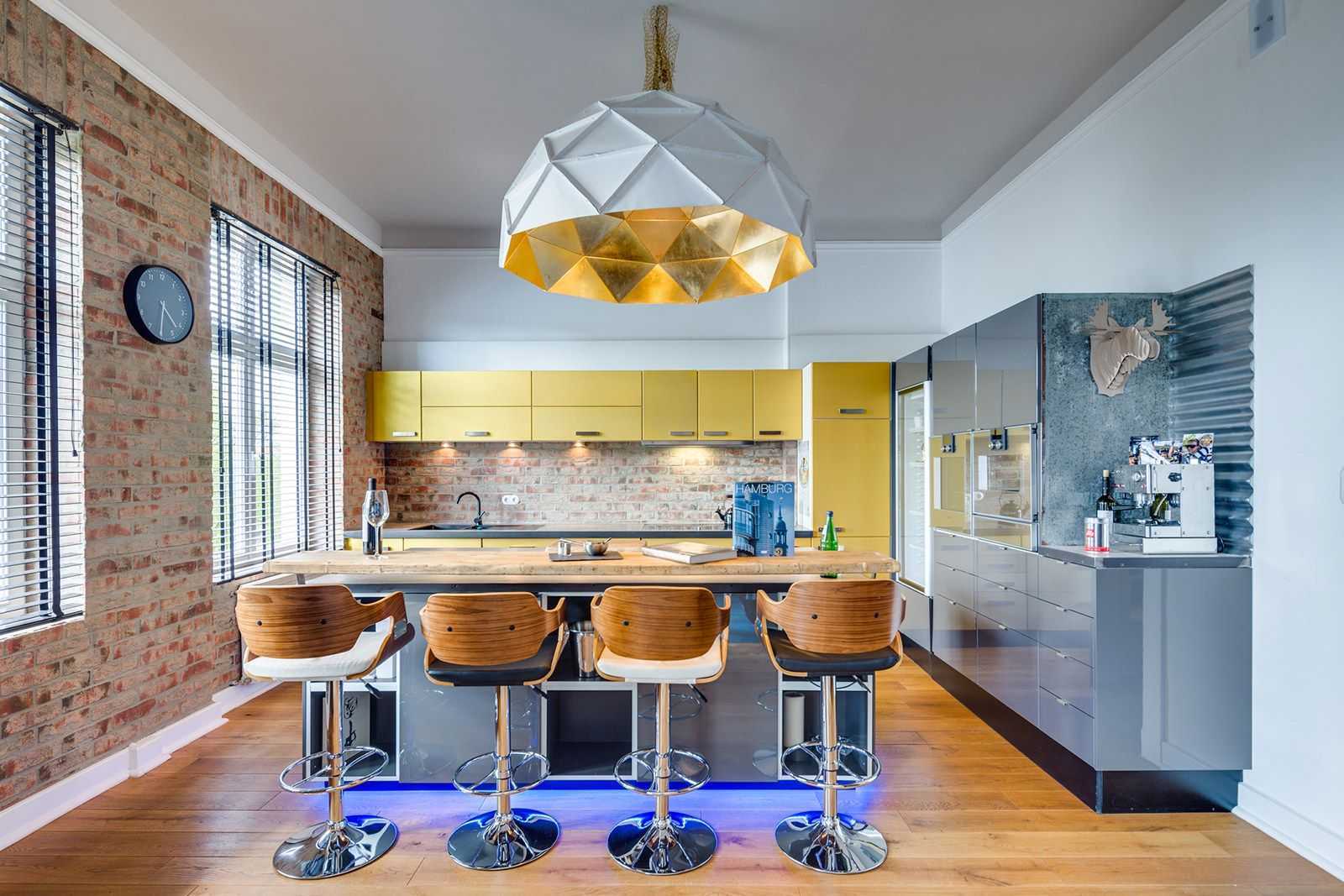 Этот стиль подходит обладателям квартир с высокими потолками. Его отличительными особенностями являются открытая планировка и совмещение разных архитектурных решений. Потолки и стены в таком помещении имеют грубую отделку. Конечно же, в огромном пространстве необходимо использовать зонирование. Вот с этой функцией в кухне-гостиной и справится барная стойка.