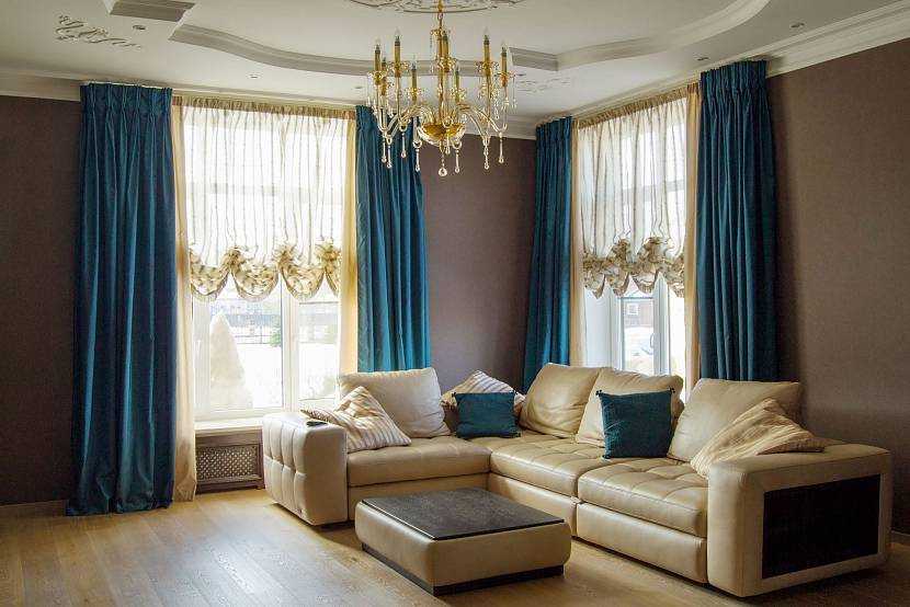 В большом зале или гостиной наружная стена может содержать два широких окна. Это даёт возможность обыграть множество дизайнерских идей. С помощью разнообразных аксессуаров и декоративных деталей получится осуществить интересные решения по созданию единой композиции, где основу будут представлять двойные шторы.