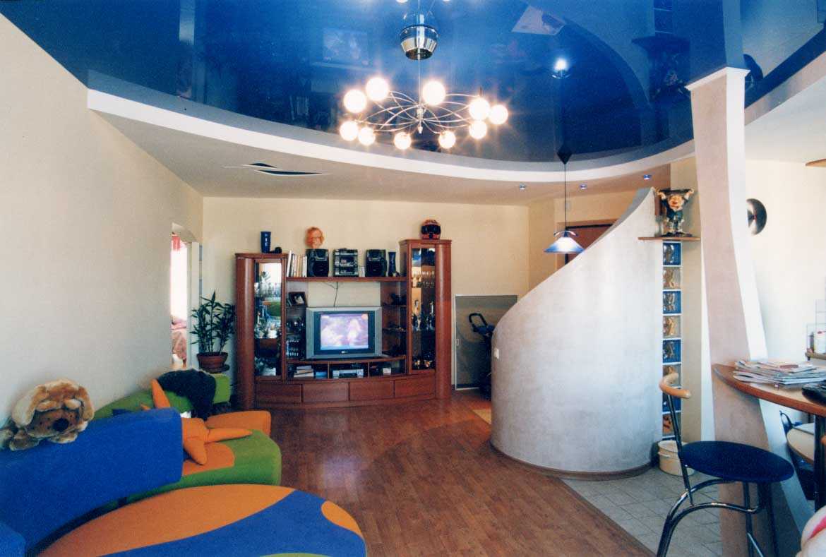 В дизайне этой комнаты чувствуется влияние моря. Квартира-студия, отделанная в тонах белого и королевского синего –это отличный выбор для молодой пары с маленькими детьми. В такой квартире никто не будет скучать.Натяжной потолок только расширяет комнату, создавая пространство, где есть много воздуха и свободы. Как вы видите, гамма цветов натяжных потолков – это исключительно предпочтение владельца квартиры. Здесь удалось прекрасно сочетать темно ореховый пол, белые стены и привнести символику моря.