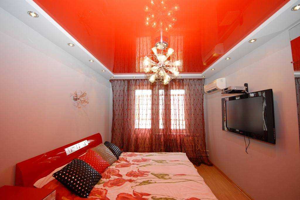В глянце потолок выглядит ярче, с матовой поверхностью — сдержаннее и спокойнее. Более тёмный вариант красного — бордовый или винный. Выглядит благородно и изысканно.