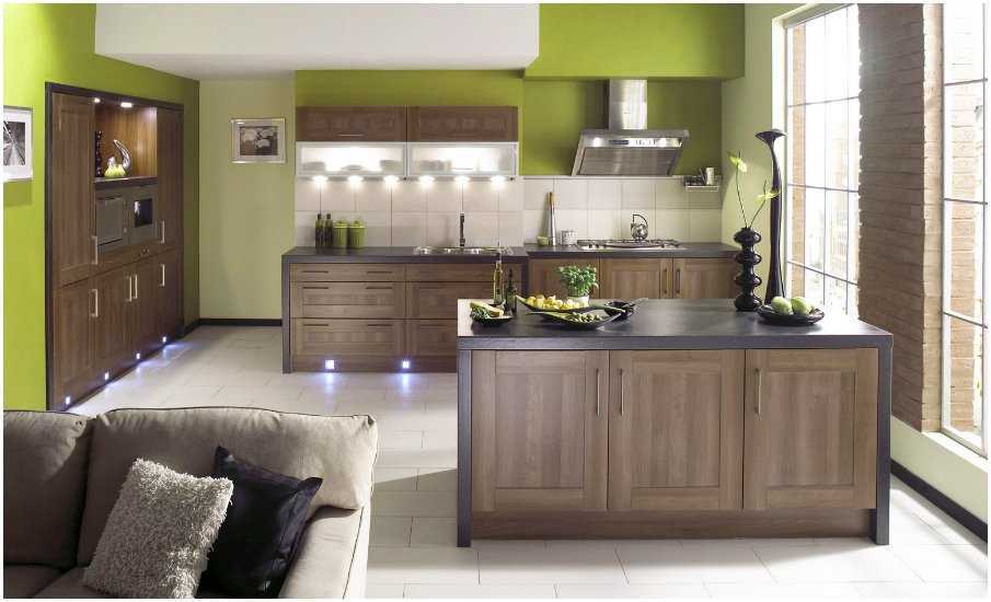 - Салатные стены требуют контрастной мебели в бежевых или шоколадных тонах. Такое сочетание цветов наиболее удачно в интерьере фисташковой кухни. Натуральное дерево отлично будет сочетаться в любом варианте.