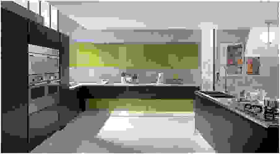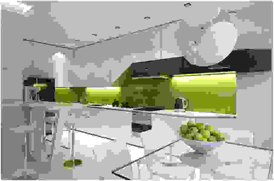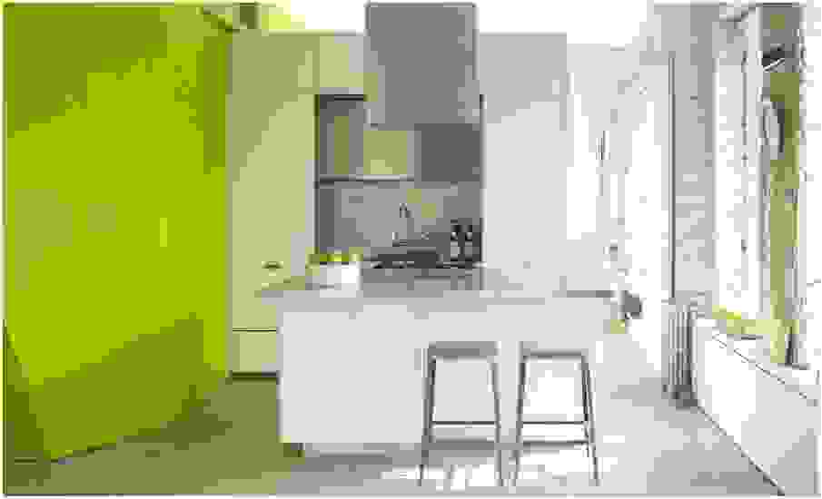 Минималистичный интерьер белоснежной кухни с акцентной фисташковой стеной