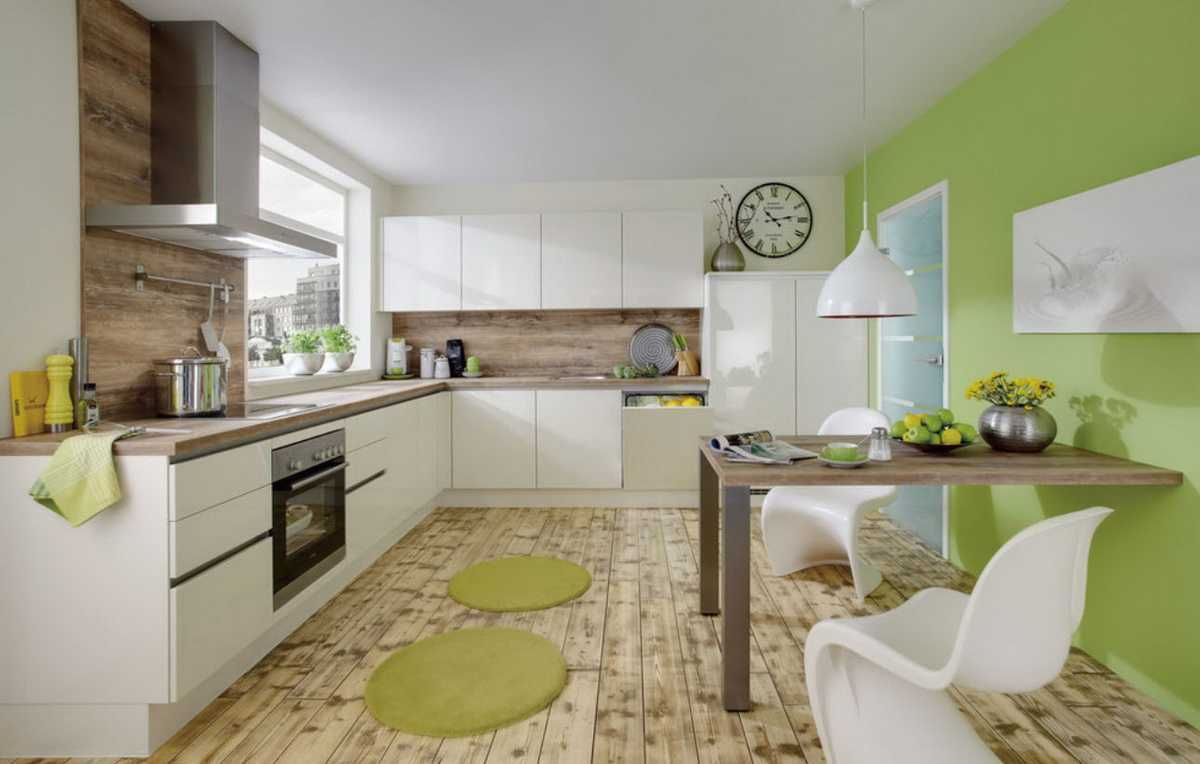 Отличительная черта таких интерьеров – акцент на натуральные материалы, экологичность и максимальная естественность. Именно поэтому для оформления кухни дополнительно используют древесину, которая, так же как и оттенки бежевого и коричневого хорошо сочетается с фисташковым цветом.
