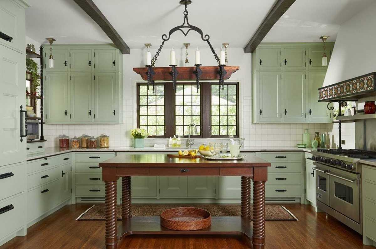 Фисташковые оттенки гармонично сочетаются с бежевым и коричневым цветами. Это идеальный выбор для оформления кухни в стиле кантри, шебби-шик и прованс.